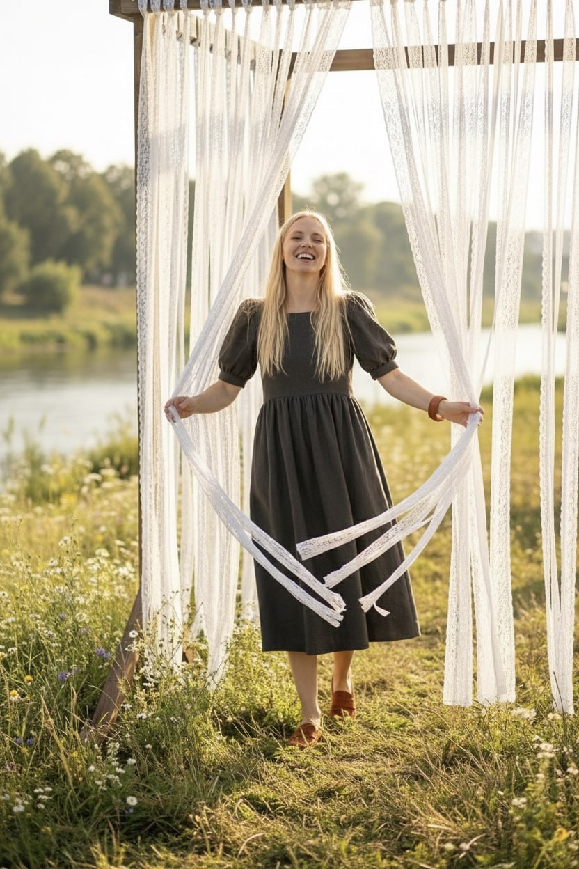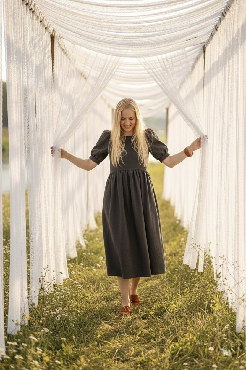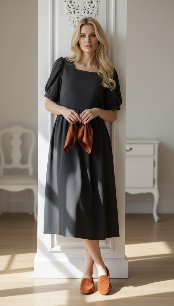 Пышные рукава-фонарики добавляют образу нотку винтажного романтизма, подчеркивая хрупкость женских рук.
