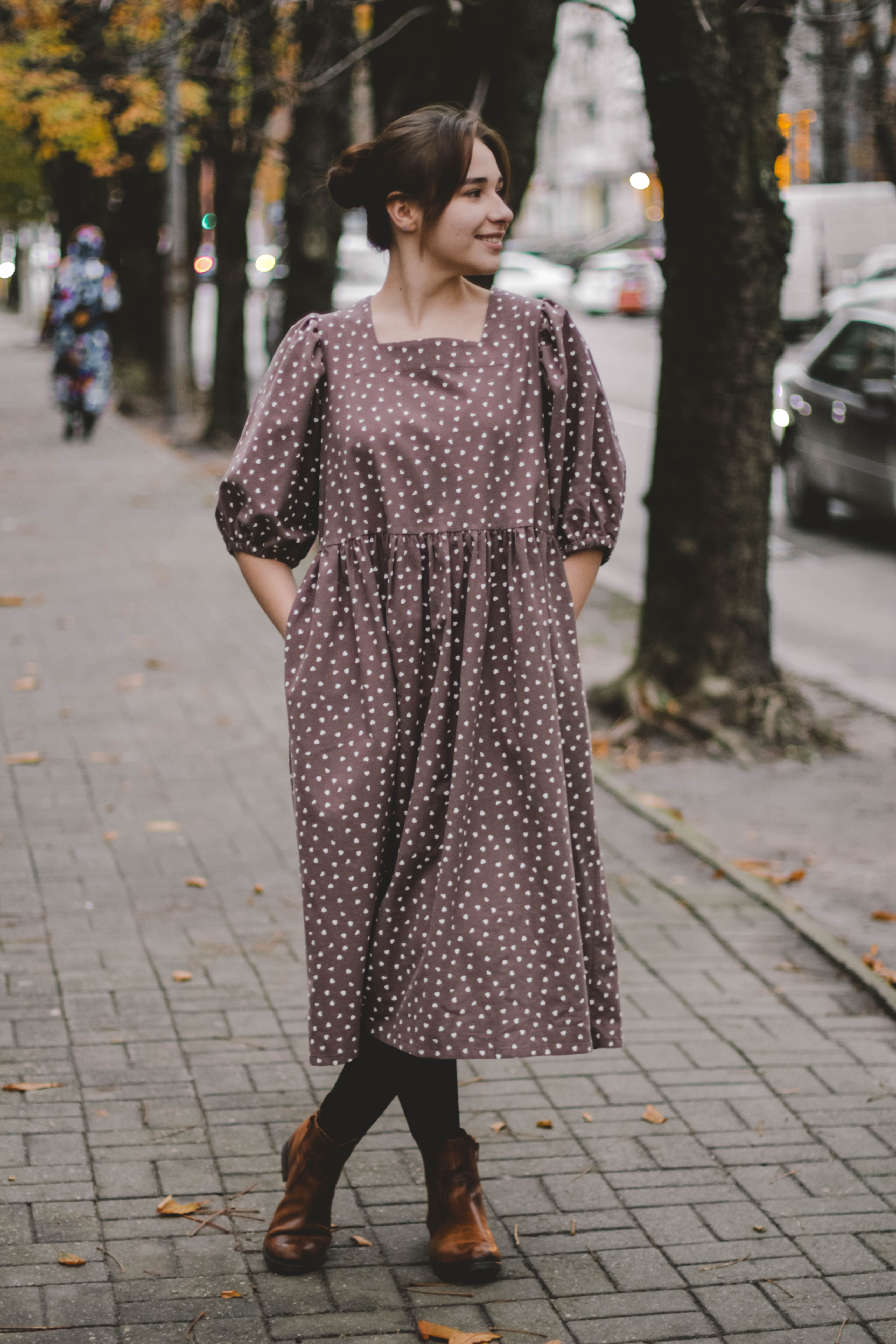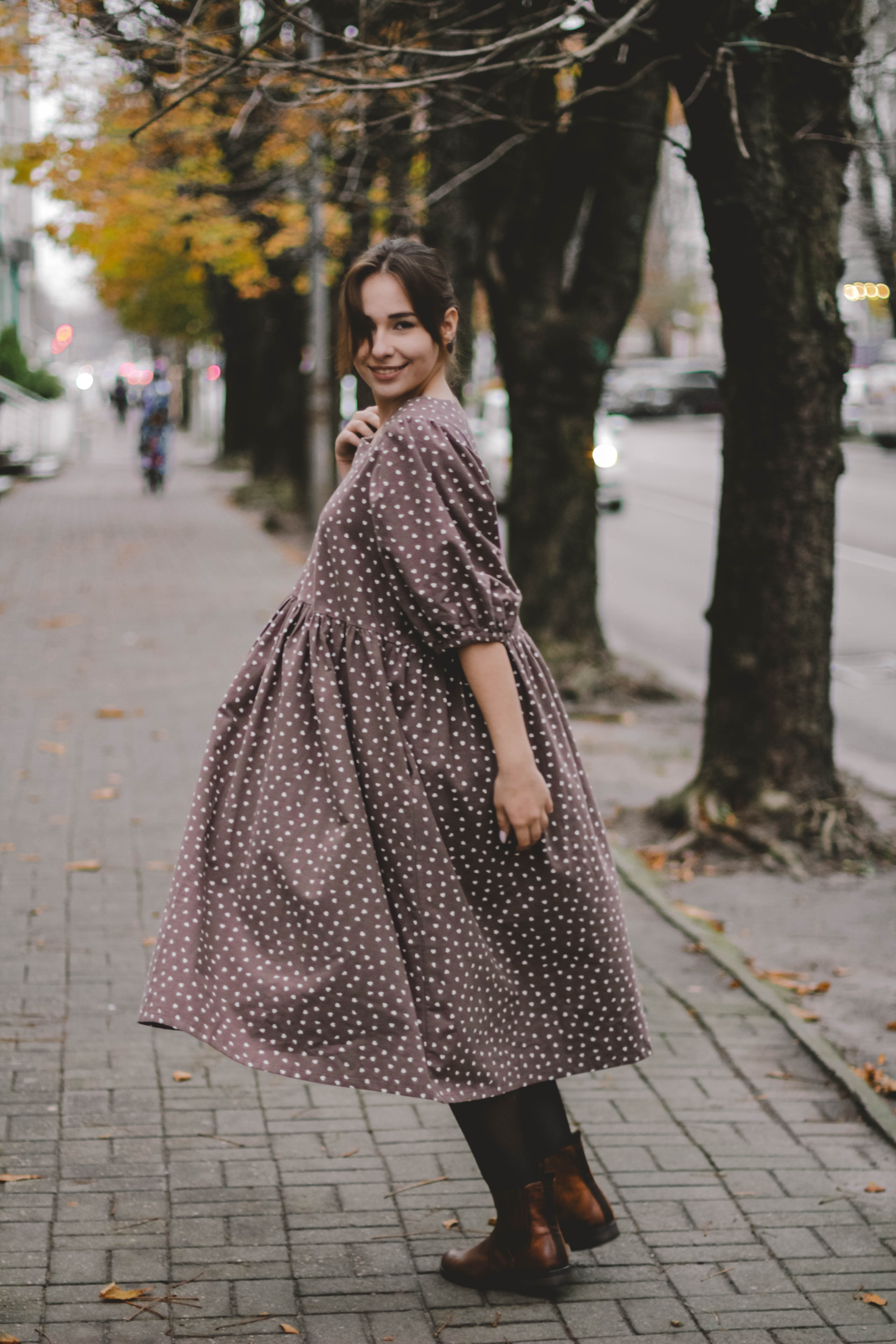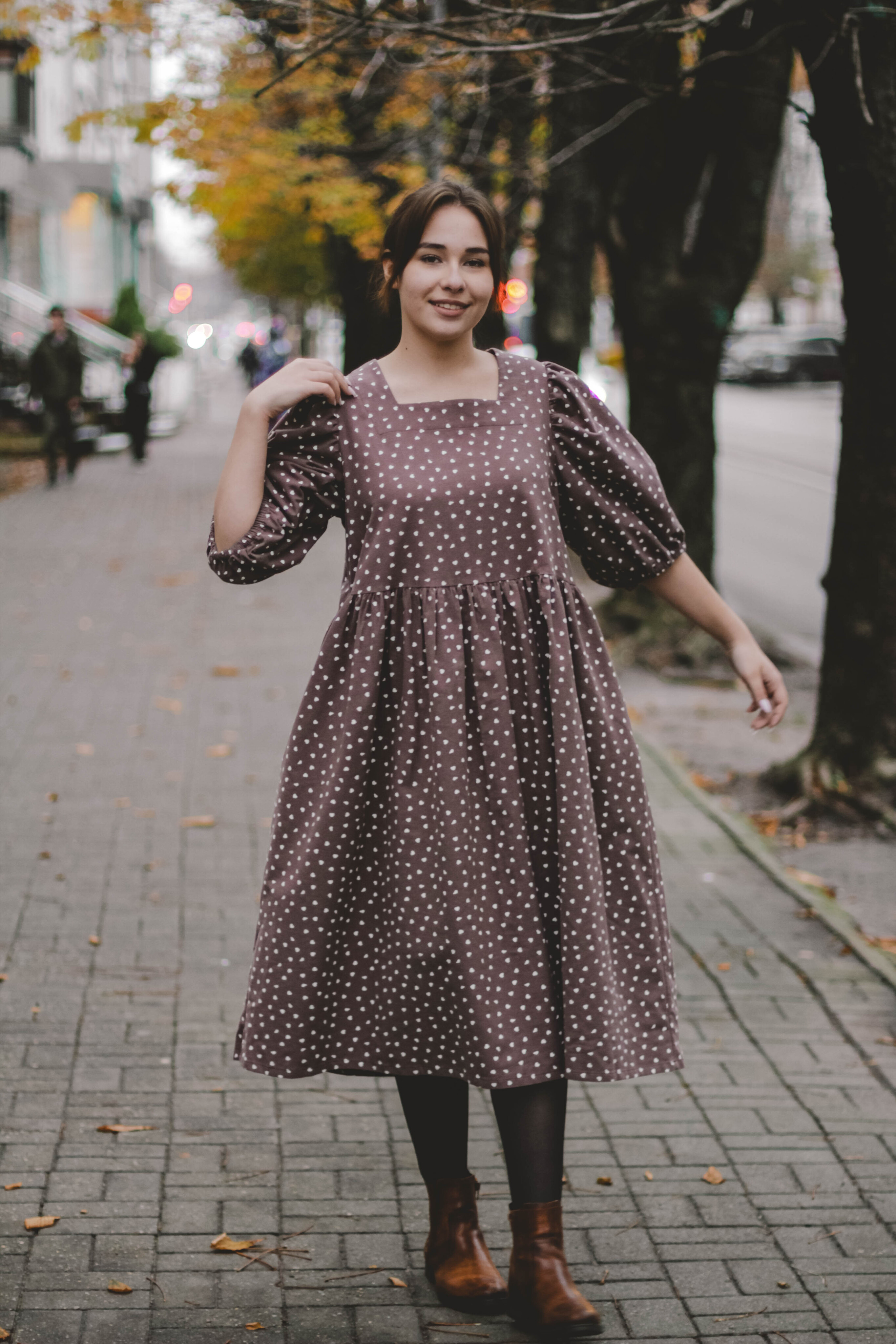 Влюблена в этот крой! Свободный силуэт, который дарит комфорт, и такие милые детали, как эти объемные рукава. Это платье-мечта для стильной осени.