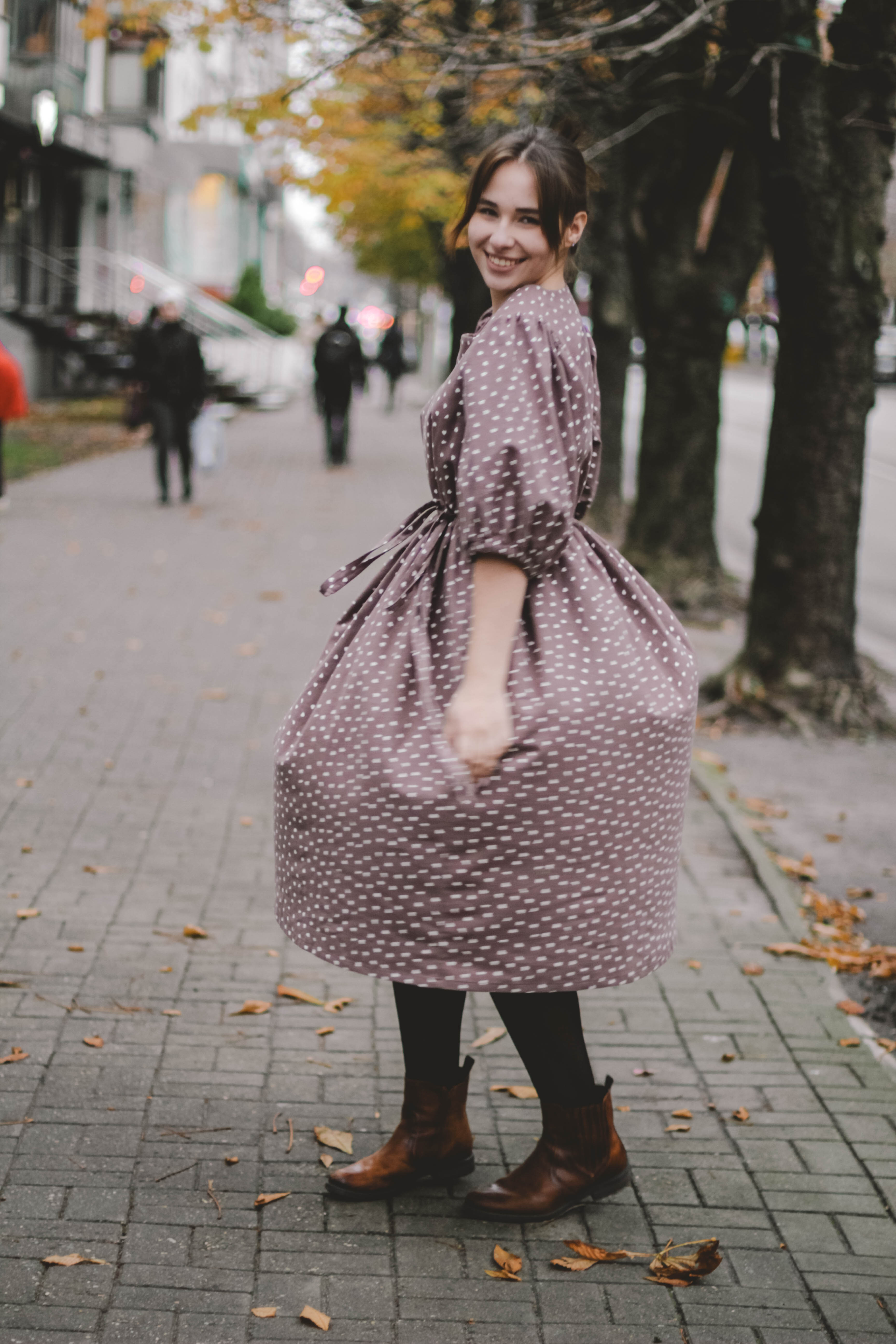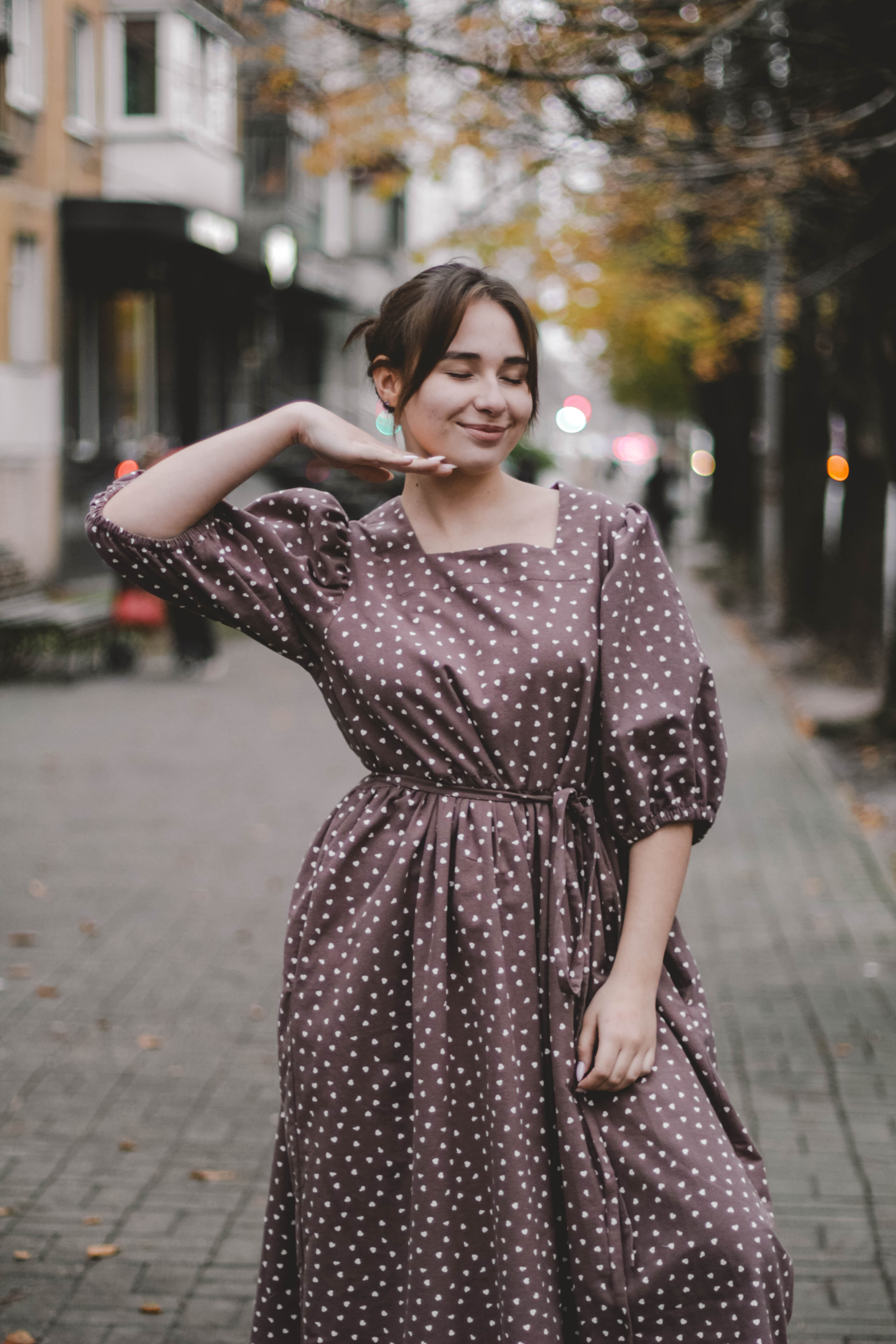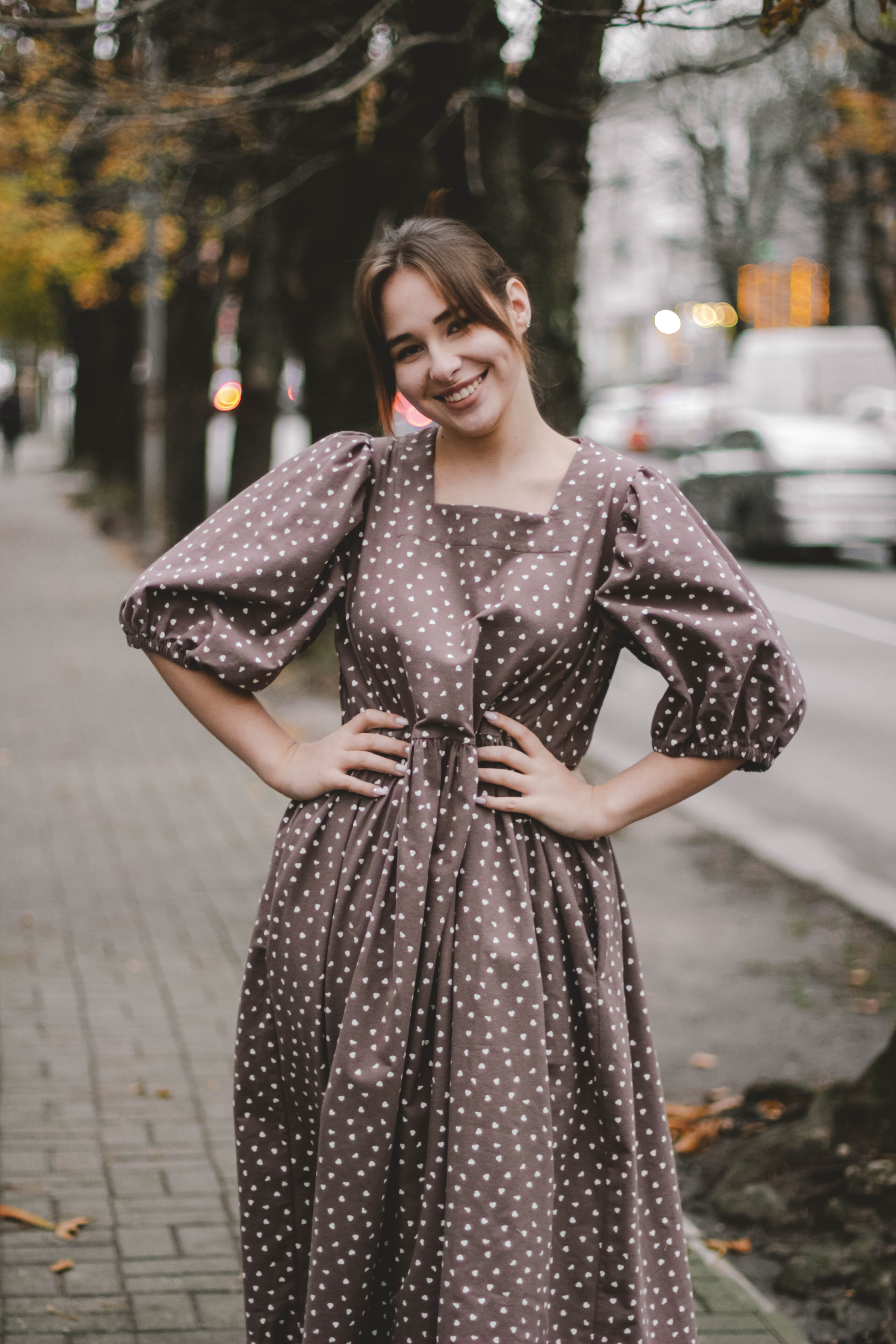 Влюблена в этот крой! Свободный силуэт, который дарит комфорт, и такие милые детали, как эти объемные рукава. Это платье-мечта для стильной осени.