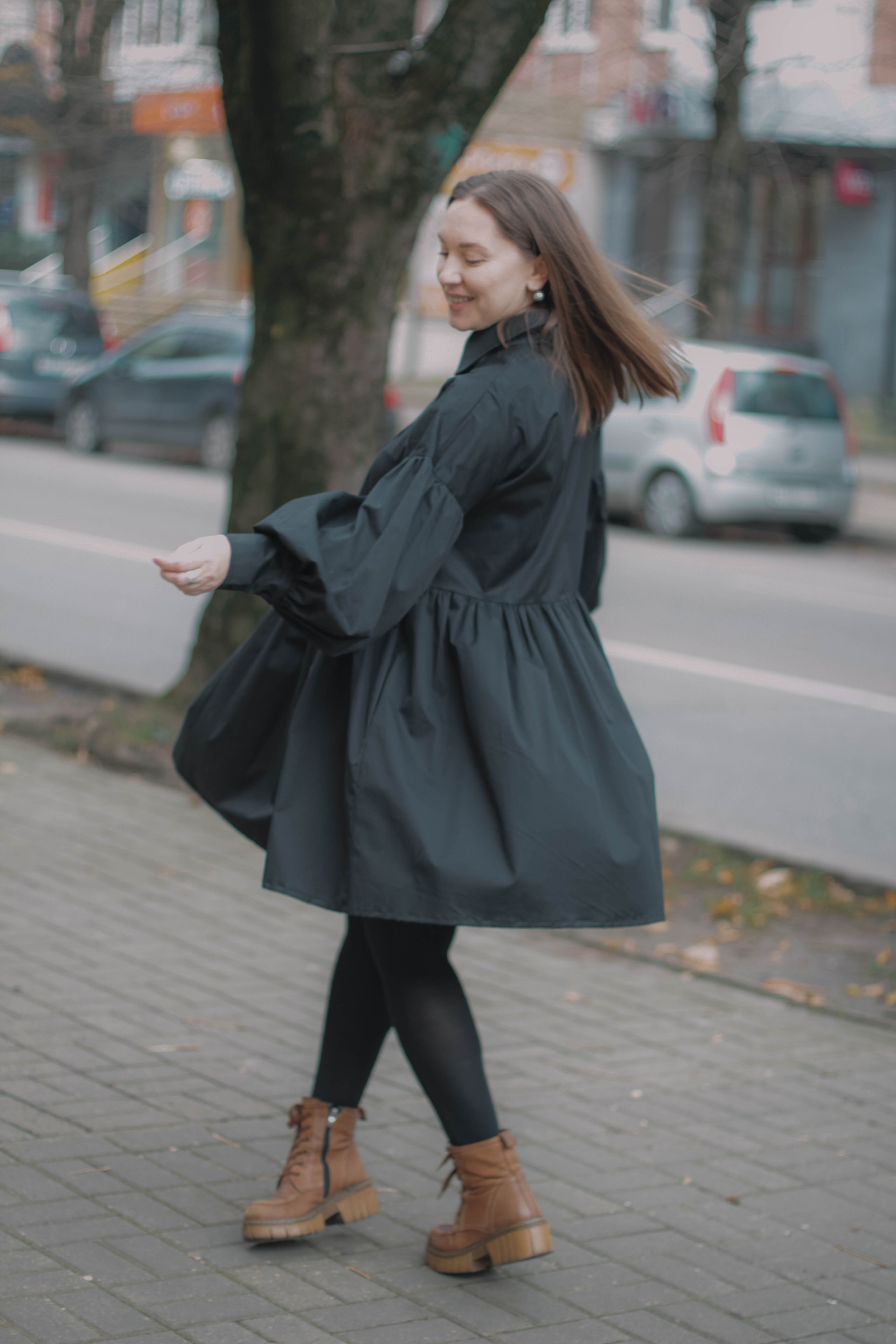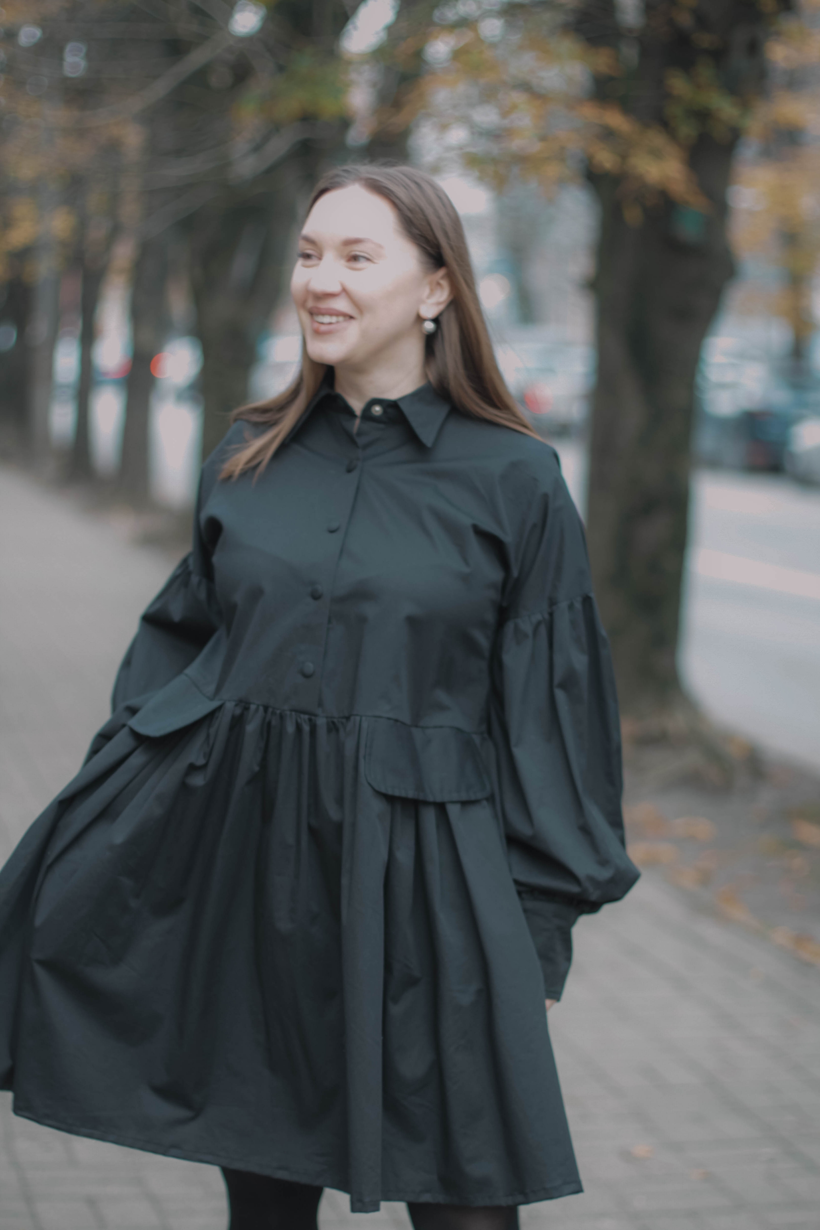 Черный хлопок: натуральный, дышащий, идеальный для долгих осенних прогулок. Стиль бохо-шик: объемные рукава-буфы, свободный крой baby-doll и пышный подол, который красиво развевается на ветру.