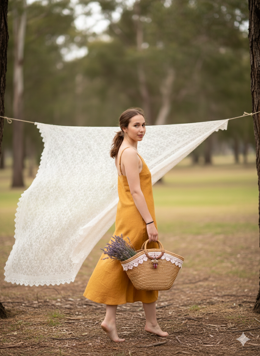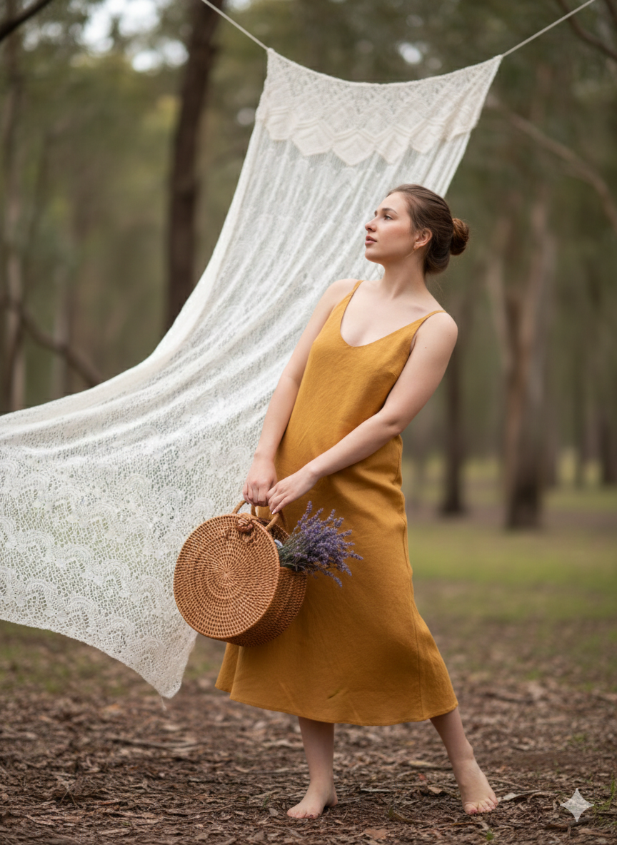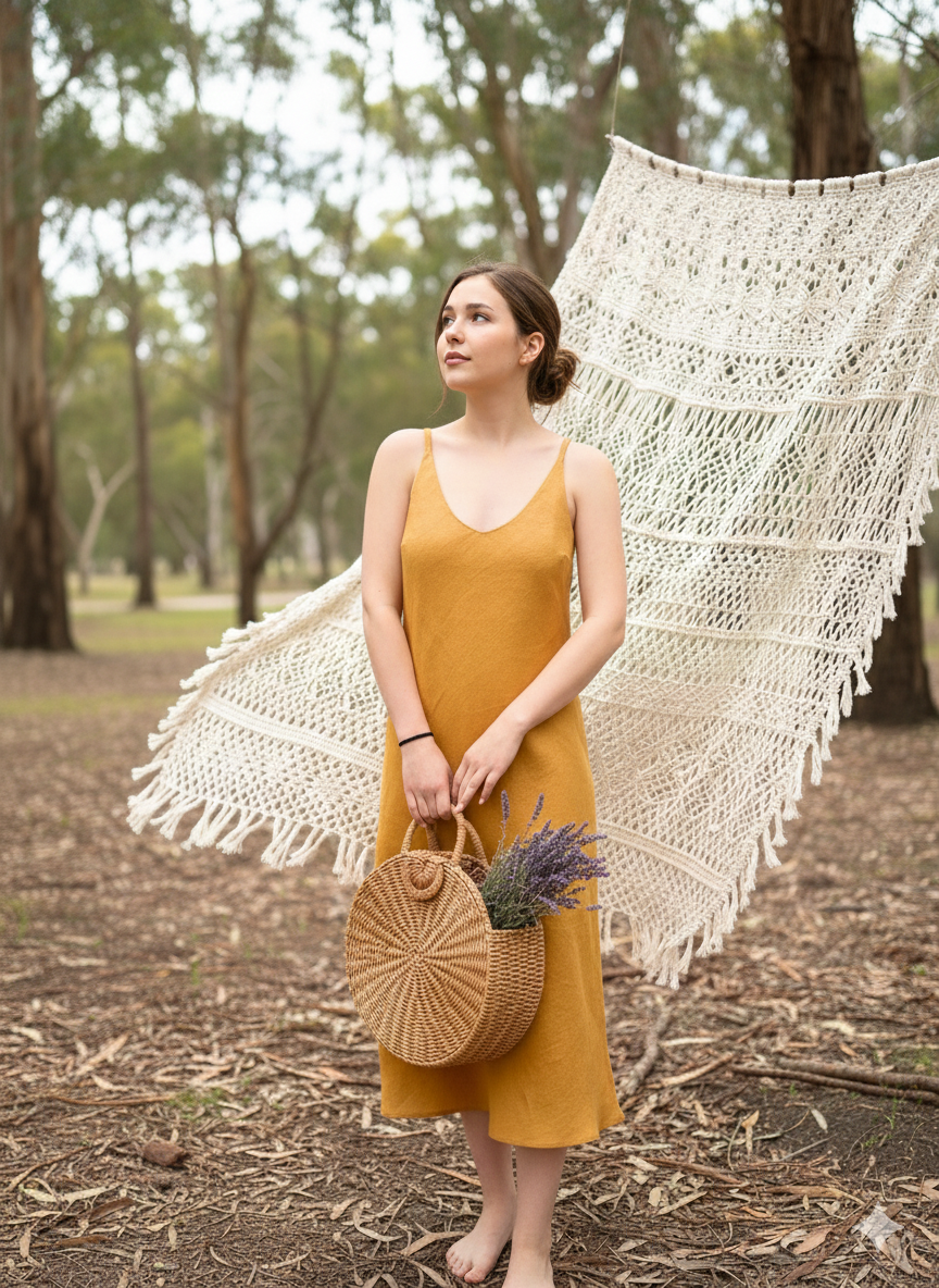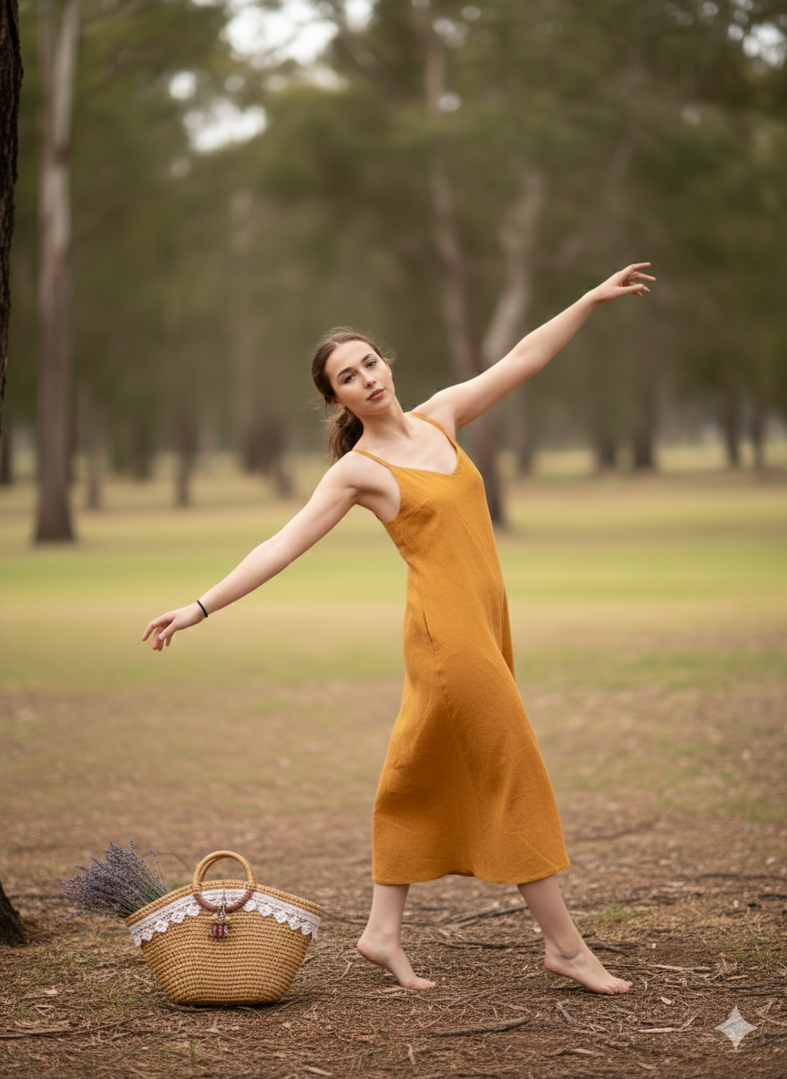Представь: тёплый вечер, лёгкий ветерок, а на тебе - это горчичное льняное платье-комбинация. Оно такое мягкое, будто обнимает, и цвет прямо светится на солнце, как спелая горчица на поле.