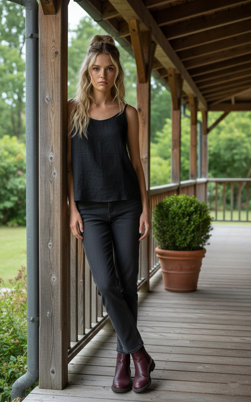 Льняной топ на тонких бретелях - как утренний туман, лёгкий и честный. Натуральный лён умягчён и спокоен. Он дышит и прохлаждает кожу.